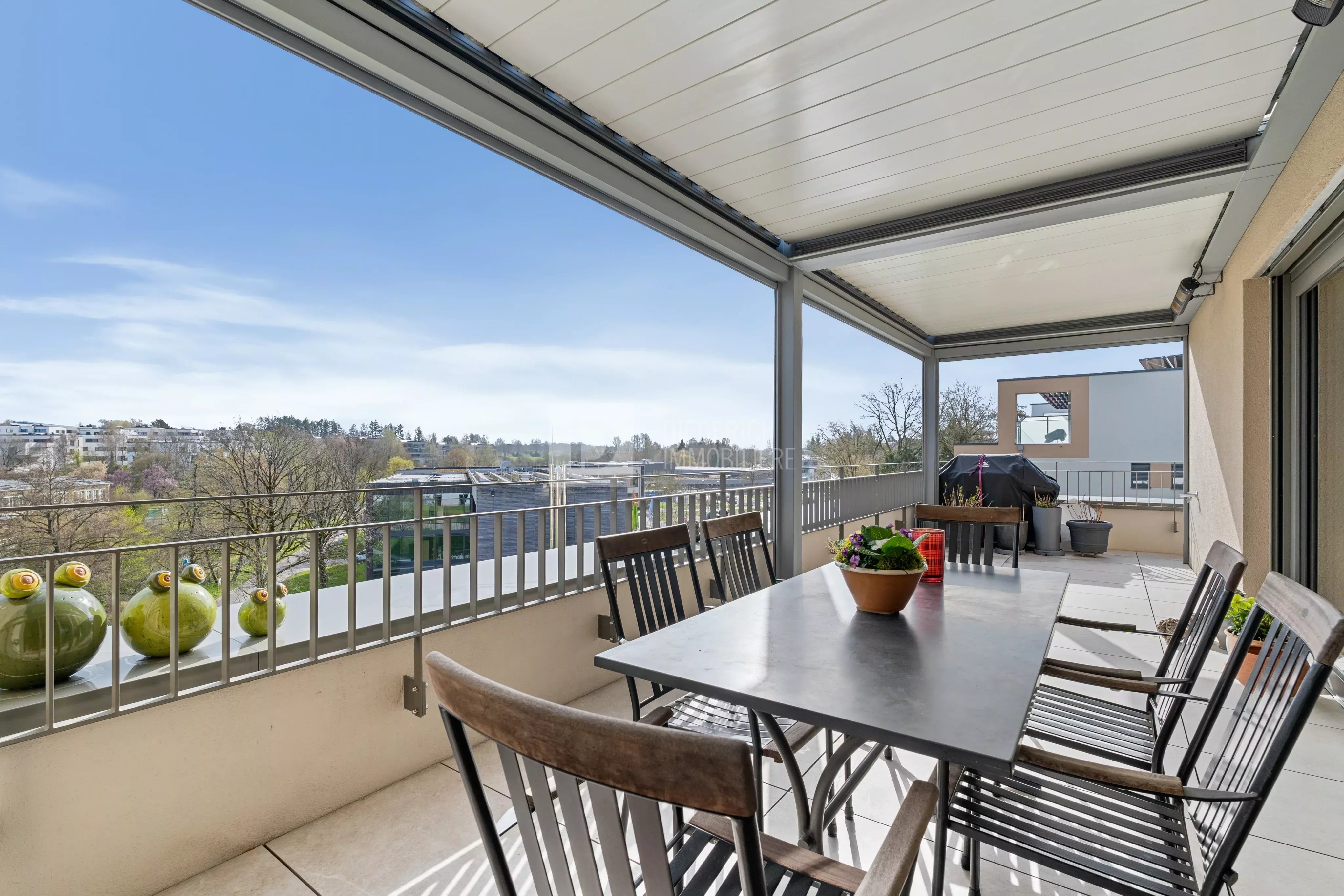 Ce penthouse de grand standing, achevé en 2024, est encore sous garantie constructeur. Il se distingue par un espace de vie magistral de 88,4 m² bénéficiant d'une luminosité naturelle constante offrant un cadre de vie raffiné et confortable. Le séjour est agrémenté d'un poêle à bois moderne et d'une cuisine de standing entièrement équipée avec îlot central et cave à vin intégrée. La pièce de vie s'ouvre sur une première splendide terrasse orientée sud-est, de 27,25 m² équipée d'une pergola à lames orientables et chauffante, offrant une vue imprenable sur l'église et la nature environnante, parfaite pour profiter de moments de détente ou recevoir vos invités en toute saison. Une seconde terrasse orientée sud-ouest de 15,32 m², accessible depuis le salon et l'une des chambres, complète parfaitement cet espace extérieur.